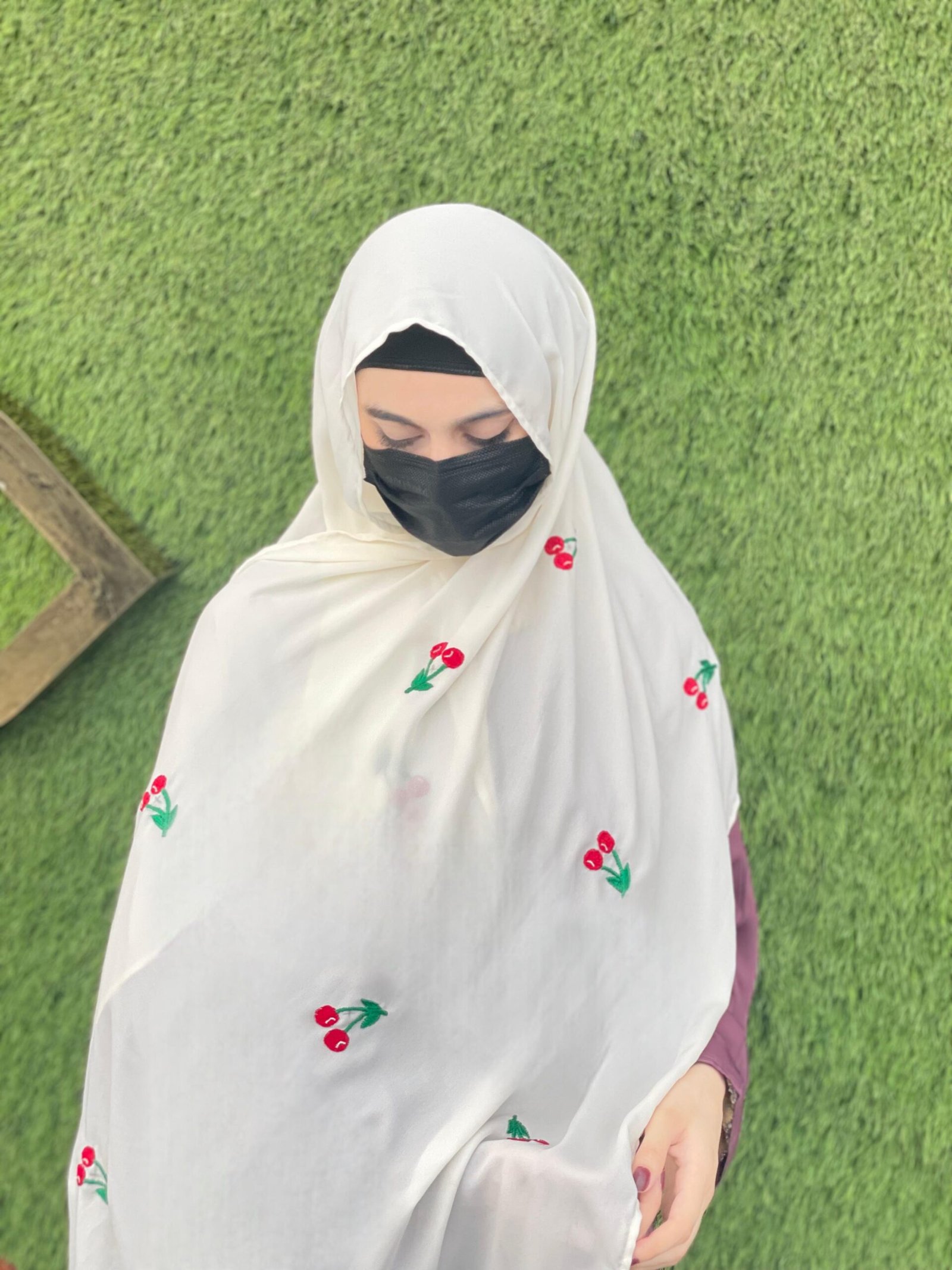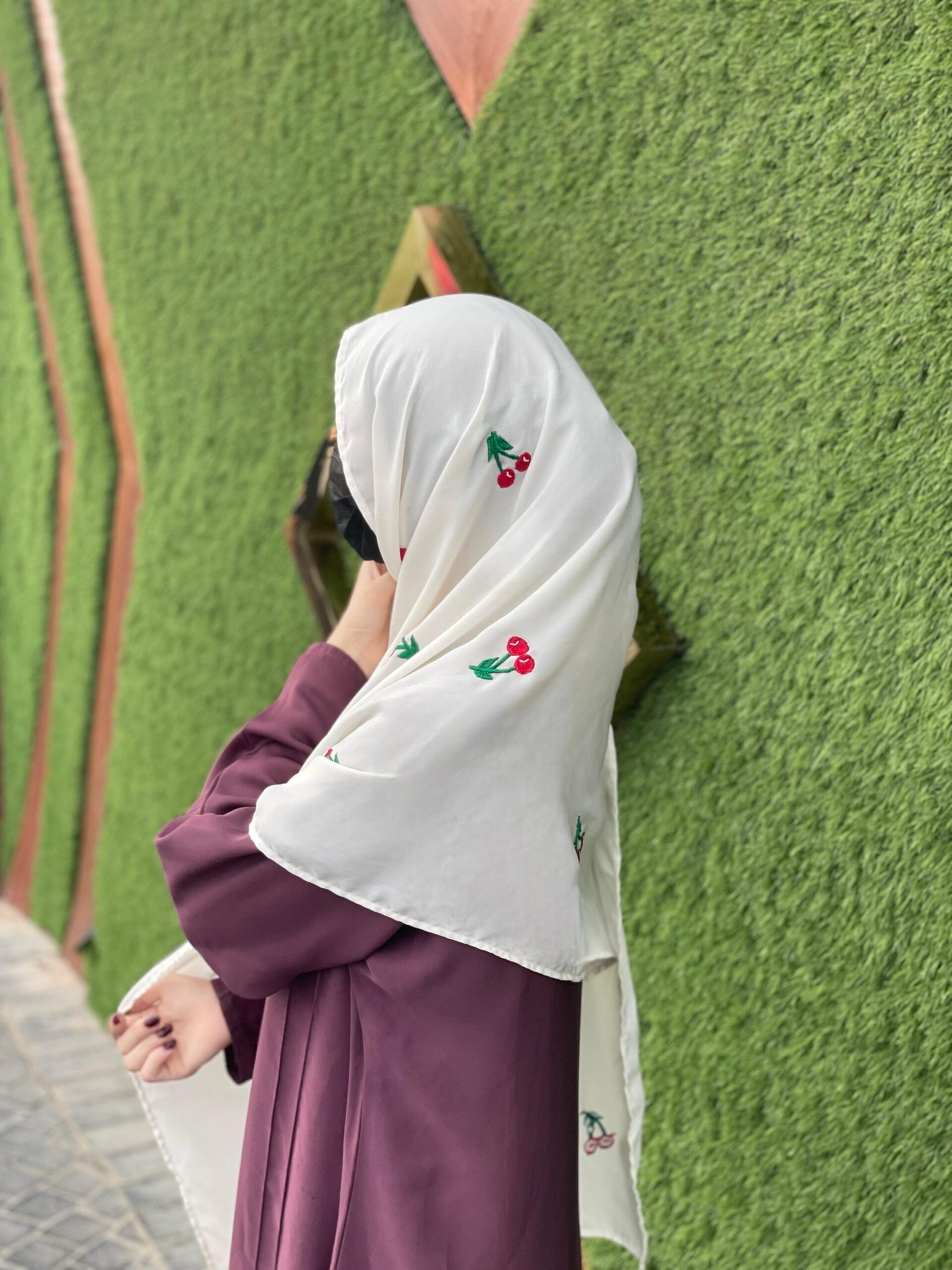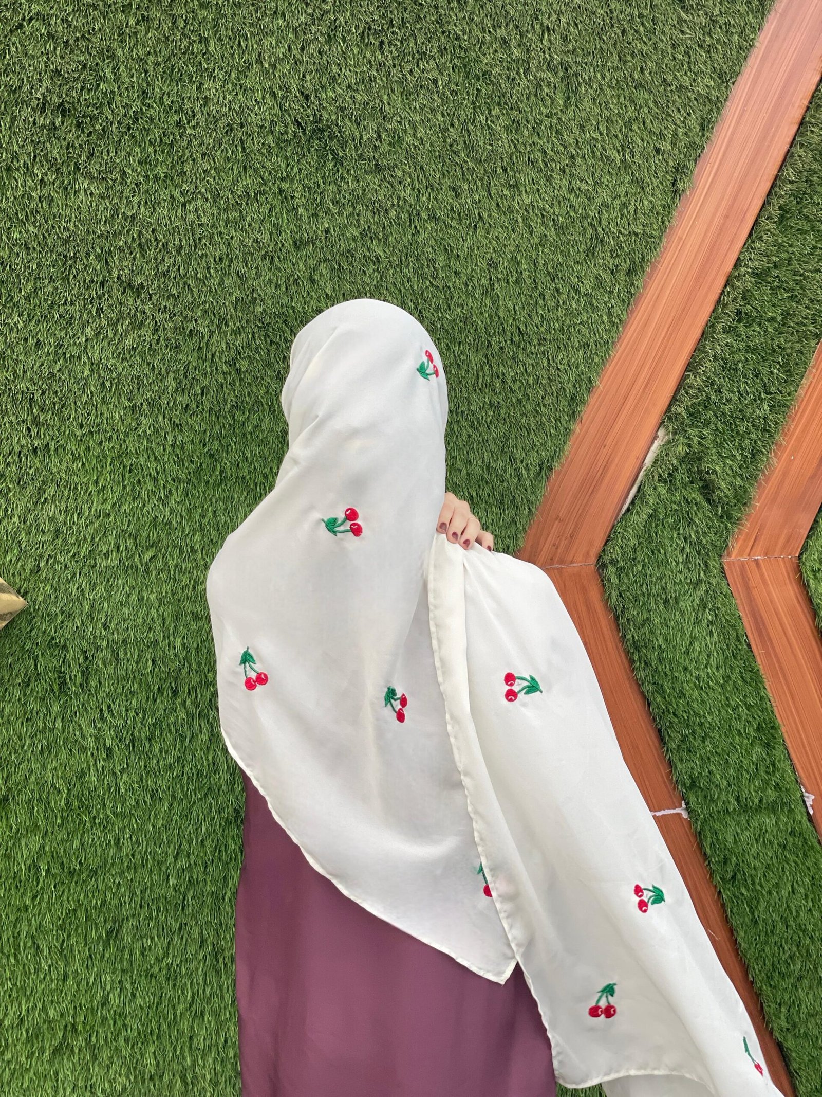 Description: A lovely Nida hijab with vibrant red and green embroidered cherry motifs, blending sweetness with elegant style. Lightweight, soft, and perfect for casual or festive wear with a fruity flair.