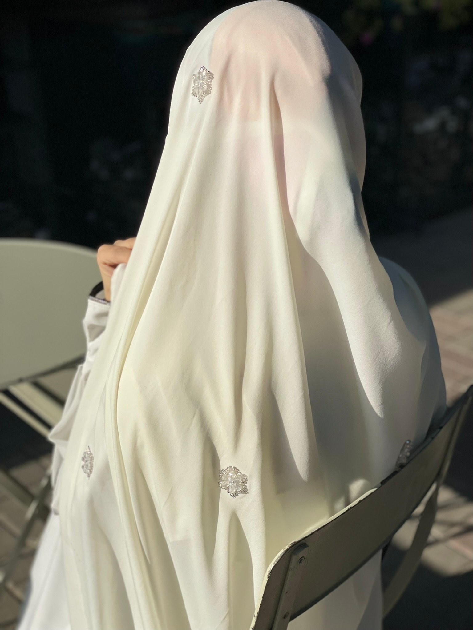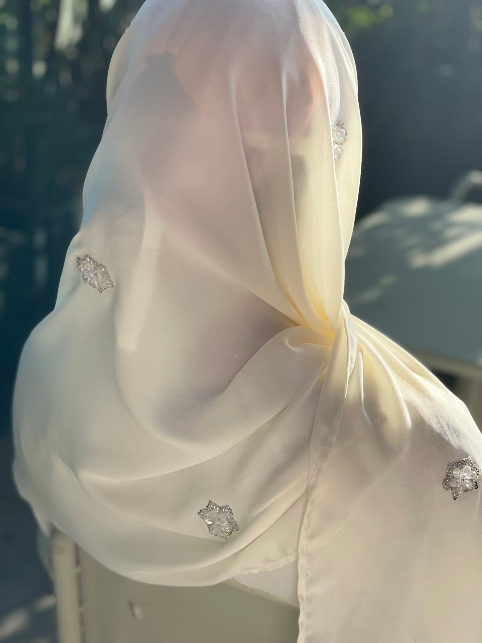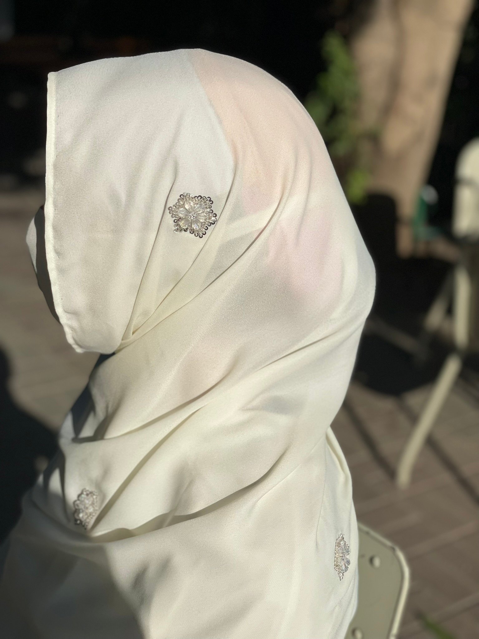 Description: An elegant white hijab with delicately placed crystal floral addah motifs. Ideal for bridal wear, nikkah events, or special white-themed occasions. Its soft fall and rich shine give a luxurious yet graceful look.