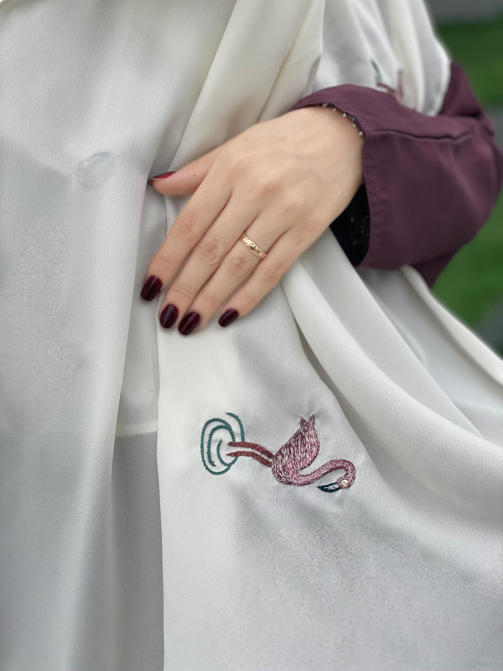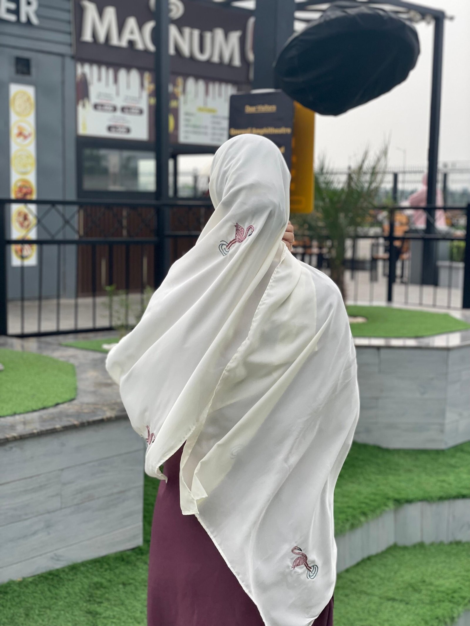 Description:A graceful Nida hijab with a playful embroidered flamingo design on the corner, exuding elegance and charm..