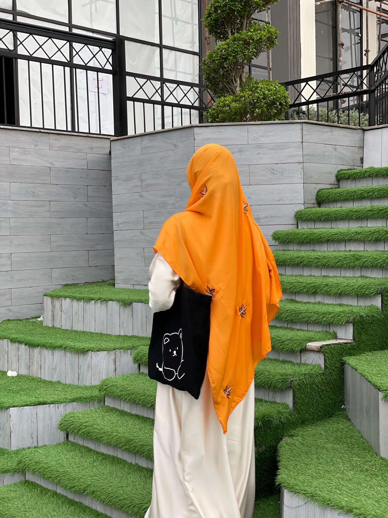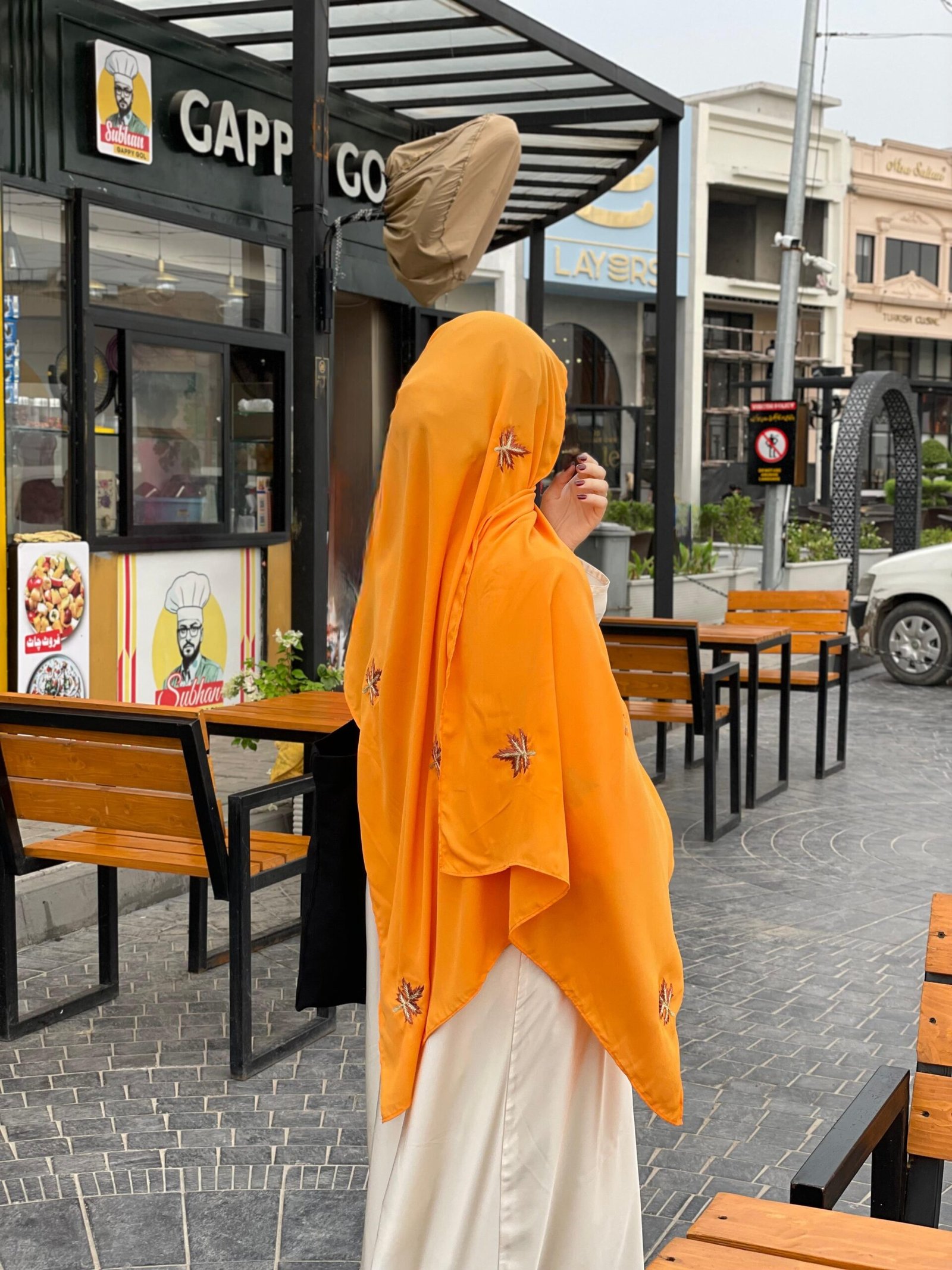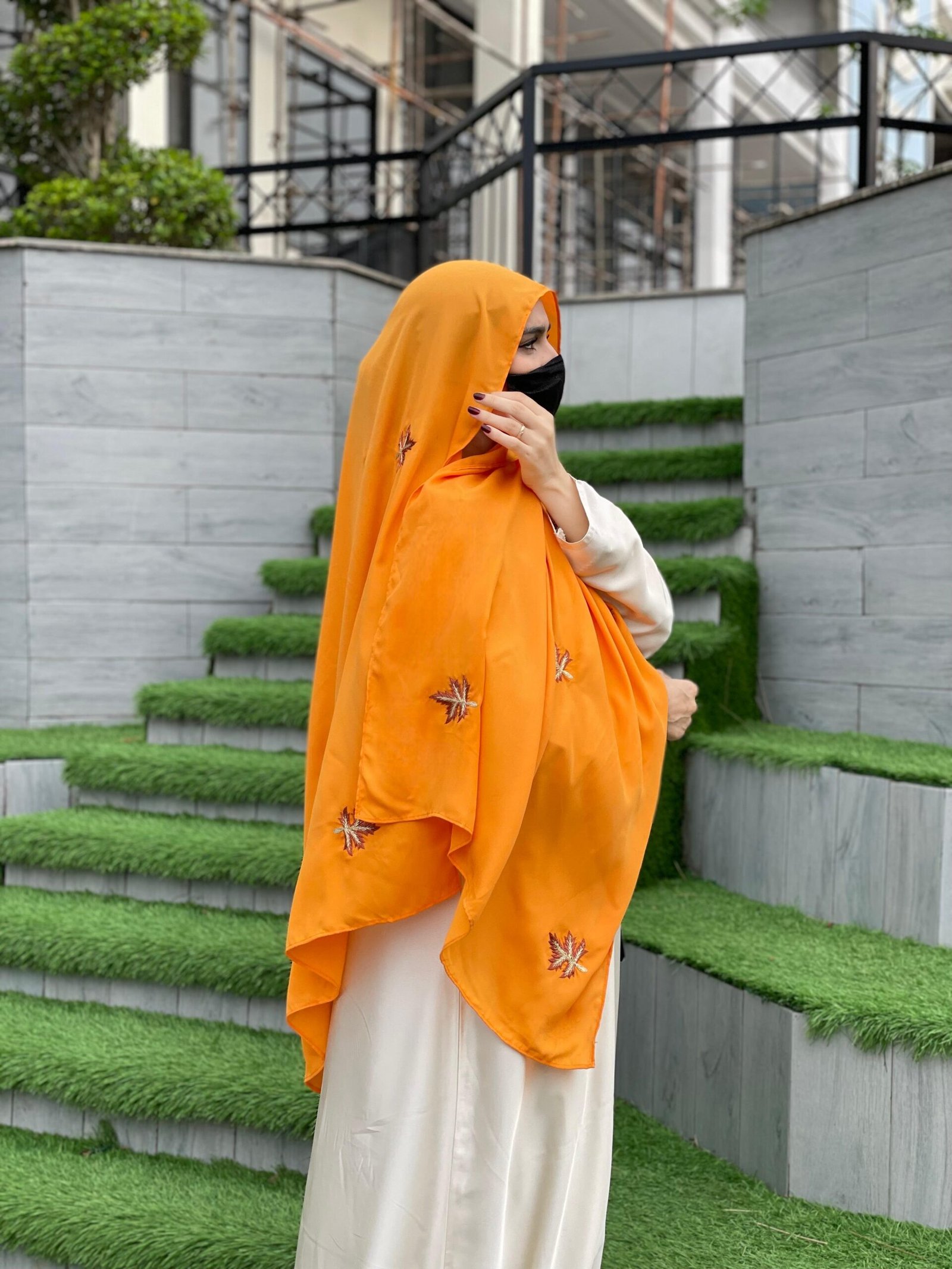 Description: A vibrant Nida hijab with striking orange embroidered maple leaves, offering a bold and elegant style. Lightweight, soft, and ideal for standout casual or festive wear with natural charm.