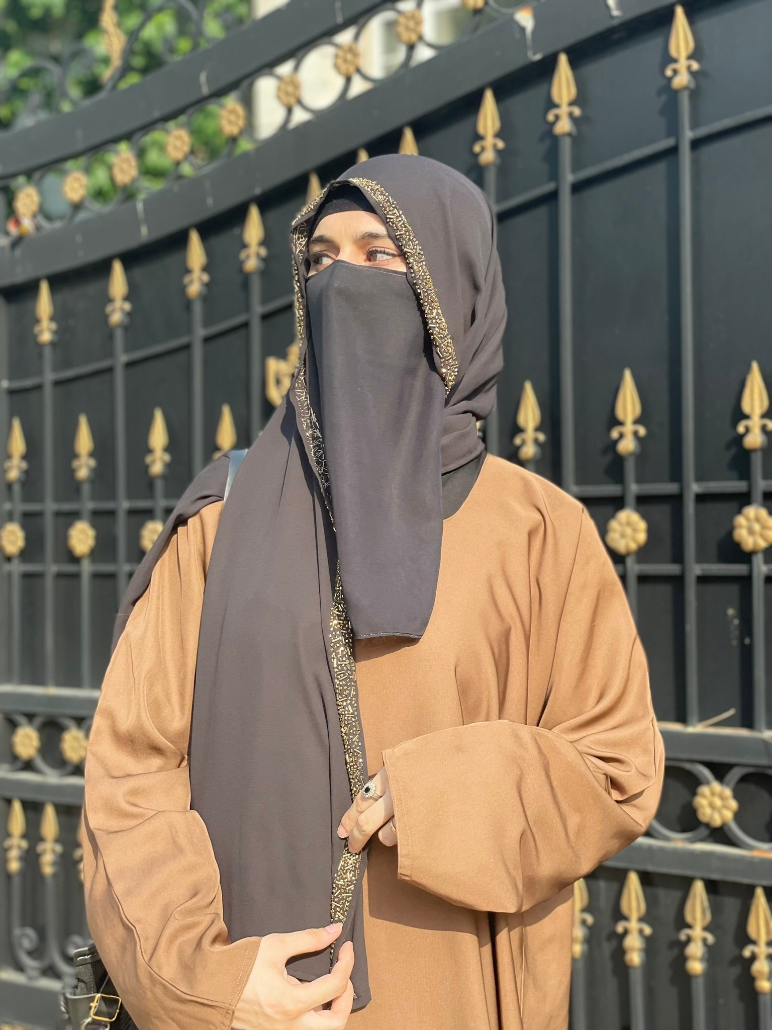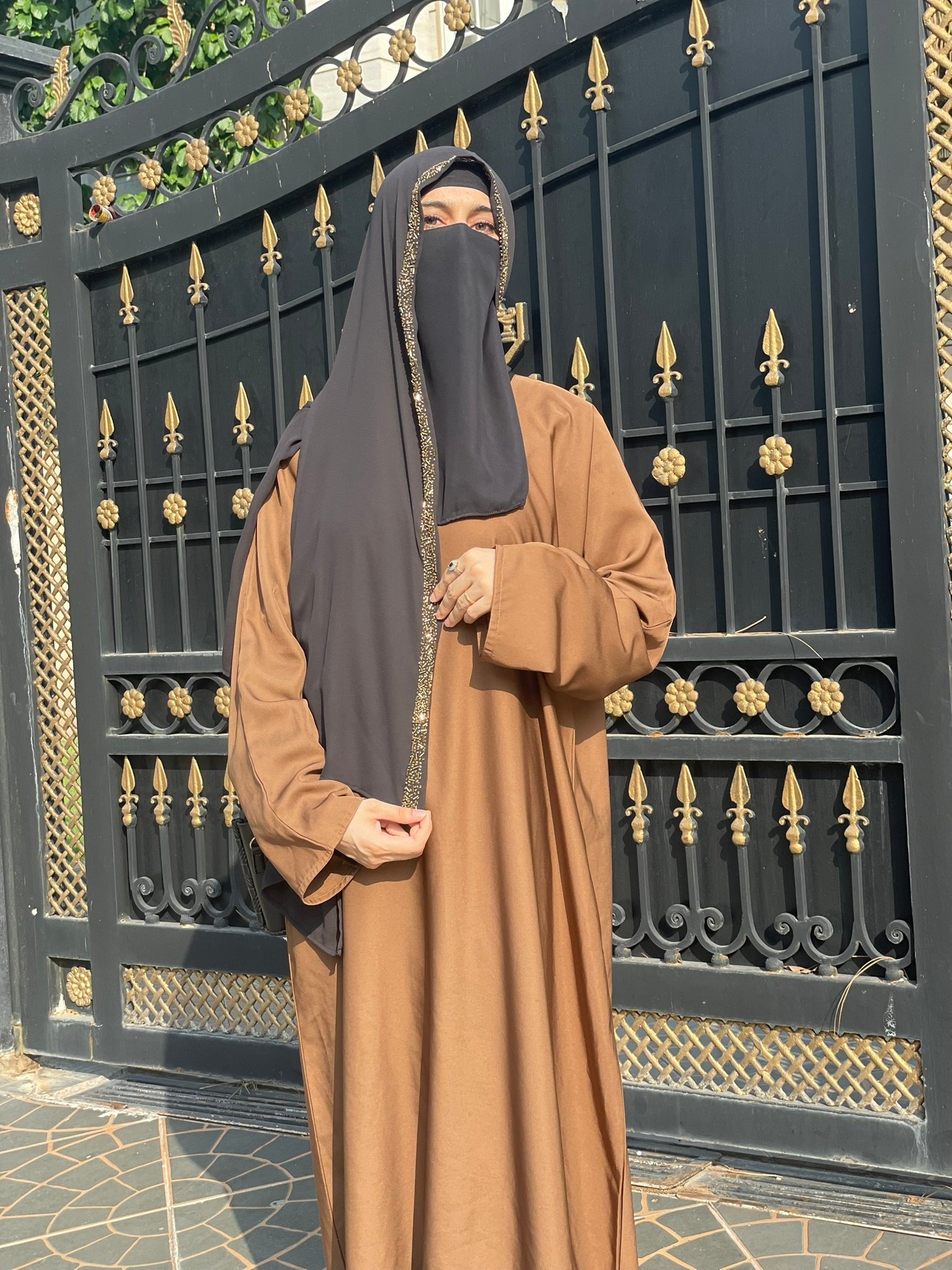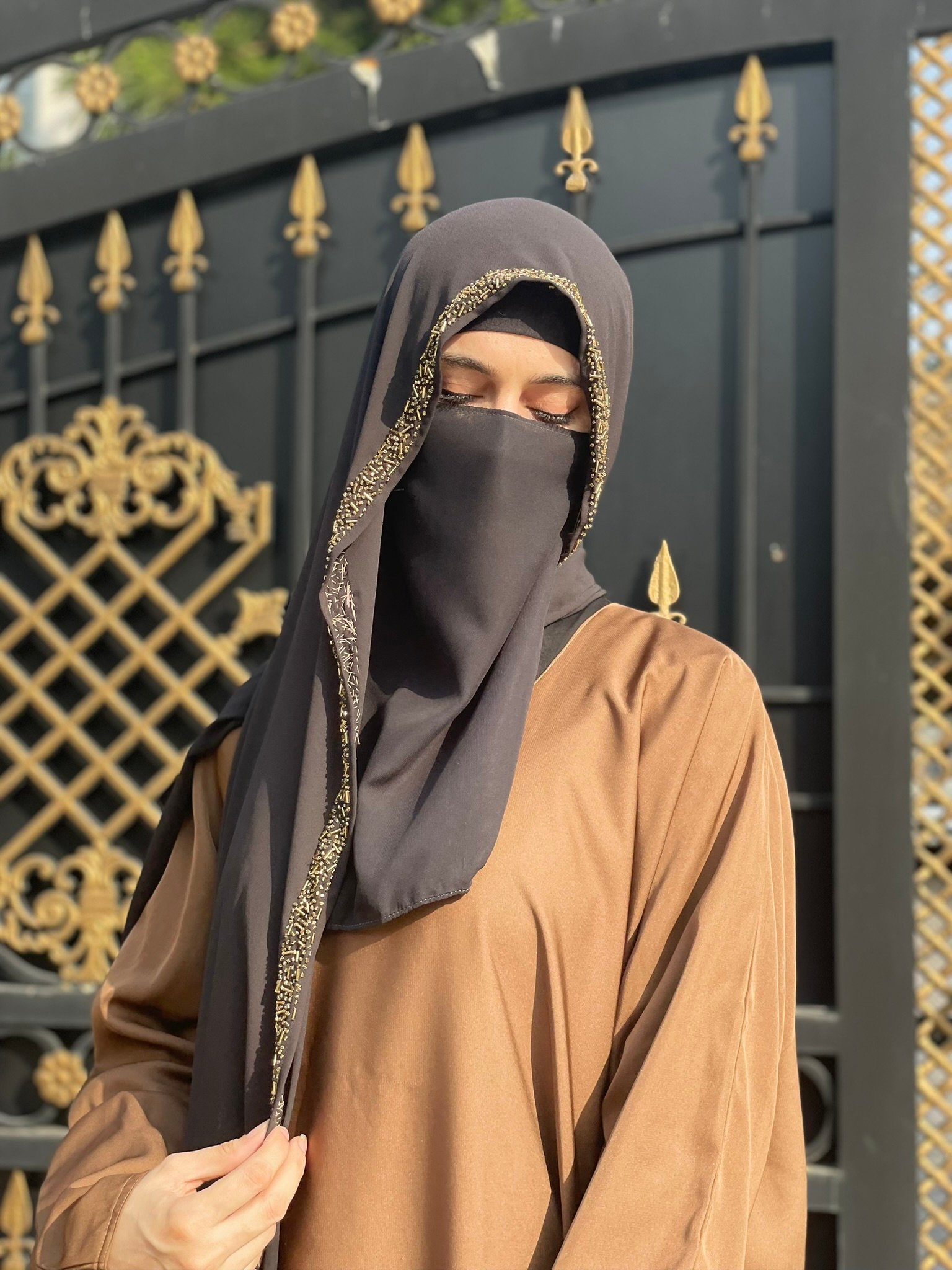 Description: Jet black hijab with rich golden border detailing — designed for classy, regal appearances. It adds an instant wow factor to even the simplest abaya.